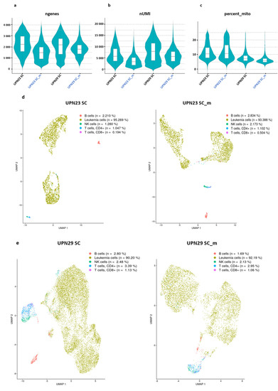 We utilized 10X Genomics scRNA-seq technology to sequence a total of 4390 cells from the UPN23 Single Cell RNA-sequencing (UPN23 SC) sample and 16,645 cells from the UPN29 SC sample, each sequenced individually. Additionally, we employed the cell hashing technique to sequence 5601 cells and 6480 cells in the UPN23 SC-m (single cell multiplexed) and UPN29 SC-m samples, respectively. The UPN23 SC sample exhibited a median of approximately 1660 genes per cell (median 1603; 1st–3rd quartile, 2248–2972), whereas the UPN23 SC-m sample showed a median of approximately 978 genes per cell (median 949; 1st–3rd quartile, 1510–2007). In the case of the UPN29 sample, we detected approximately 2191 genes per cell in UPN29 SC (median 1373; 1st–3rd quartile, 2209–2759) compared to 1763 genes per cell in UPN29 SC-m (median 1356; 1st–3rd quartile, 1772–2153) (Figure 1a, Table 2). The number of unique molecular identifiers (UMIs) captured, which represents the transcripts identified in each sequence read to prevent inflation due to PCR amplification during library preparation, was relatively higher in the individually sequenced samples (median of 4015 for UPN23 SC and 7765 for UPN29 SC) compared to the multiplexed samples (median of 3978 in UPN23 SC-m and 5554 in UPN29 SC-m) (Figure 1b). Furthermore, we observed consistency between the two approaches in terms of the percentages of mitochondrial genes in each patient (Figure 1c). Based on this quality control analysis, we found consistency in the sequencing results obtained from both approaches.