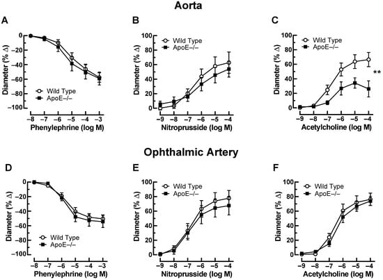 Figure 1. Responses of the aorta from ApoE−/− and wild-type mice to phenylephrine (A), to nitroprusside (B), and to acetylcholine (C). Of note, reactivity of the aorta to acetylcholine was impaired in ApoE−/− mice. Ophthalmic artery reactivity to phenylephrine (D), to nitroprusside (E), and to acetylcholine (F) did not differ between both mouse genotypes. Data are presented as mean ± SE (n = 8 per concentration and genotype; ** p < 0.01).