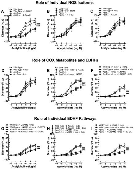 Figure 2. Ophthalmic artery responses of ApoE−/− and wild-type mice to acetylcholine before and after incubation with the non-isoform-selective NOS inhibitor, Nω-nitro-L-arginine methyl ester (L-NAME) (A), the selective nNOS blocker, 1-[2-(trifluoromethyl)phenyl]imidazole (TRIM) (B), and the selective iNOS inhibitor, aminoguanidine (AGD) (C). Among these three NOS blockers, only L-NAME markedly blocked responses in ApoE−/− and wild-type mice, indicative of eNOS involvement. The non-isoform-selective COX inhibitor, indomethacin (Indo) (D), had no effect on cholinergic vasodilation, while combined blockade with L-NAME and Indo (E) blocked vasodilation responses to a similar extent as L-NAME alone. The residual portion of the vasodilation response in ophthalmic arteries incubated with L-NAME and Indo was almost completely abolished after adding 30 mM of potassium chloride (KCl) (F), indicative of endothelium-derived hyperpolarizing factor (EDHF) involvement. Blockade of the cytochrome P450 monoxygenase (CYP450) and 12/15-lipoxygenase pathways with 17-octadecynoic acid (17-ODYA) (G) and baicalein (Baic) (H), respectively, as well as of gap junctions with 18α-glycyrrhetinic acid (18α-GA) (I) reduced vasodilation responses to a similar extent in L-NAME and Indo-incubated ophthalmic arteries of both mouse genotypes, suggesting contribution of these pathways to vasodilation. Data are presented as mean ± SE (n = 8 per concentration and genotype; ### p < 0.001, ApoE−/− mice treated versus non-treated; *** p < 0.001, wild-type mice treated versus non-treated).