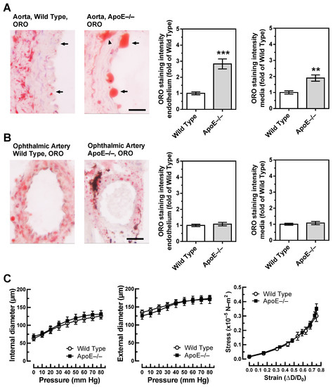 Figure 3. Lipid content, visualized by Oil Red O (ORO, red color) was markedly increased in the aorta of ApoE−/− mice and was especially pronounced in the endothelium (A). In contrast, lipid content was similar in the ophthalmic artery from wild-type and ApoE−/− mice (B). The dark areas in the ophthalmic artery cross-section of the ApoE−/− mouse are melanin deposits, which are physiologically found in the vascular wall of pigmented mice and are not specific for ApoE−/− mice. Relation between vascular internal and external diameters (µm) to the luminal pressure (mmHg), as well as the stress (in ×10−5 N-m2)–strain (in ΔD-D₀) relation did not differ between ophthalmic arteries of wild-type and ApoE−/− mice (C). Data are presented as mean ± SE; *** p < 0.0001; ** p < 0.001. The black arrows point to the endothelium, and the arrowhead points to a lipid-rich lesion in the media; scale bar = 20 µm.