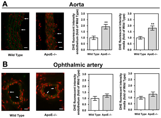 Figure 4. Dihydroethidium (DHE) staining intensity (red) was markedly increased in the endothelium and the media of the aorta (A) but not in the ophthalmic artery (B). For each vascular bed and mouse genotype, a representative photograph is presented as a merged picture of the DHE staining and the autofluorescence of the elastic lamina (green) to visualize the localization of cells within the vascular wall. The white arrows point to the endothelial layer. Data are presented as mean ± SE normalized to wild-type controls (n = 8 per genotype; ** p < 0.01, ApoE−/− versus wild-type mice). Scale bar = 20 µm.