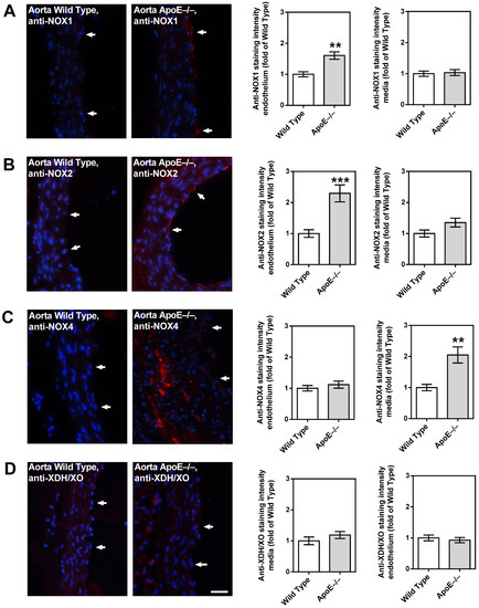 Figure 6. Immunofluorescence staining for pro-oxidative redox enzymes in aortic tissue sections. Immunoreactivity to NOX1 was markedly elevated in the endothelium of ApoE−/− mice (A). Likewise, NOX2 immunoreactivity was pronounced in the ApoE−/− mouse endothelium (B). Interestingly, NOX4 immunoreactivity was not elevated in the endothelium, but in the media of ApoE−/− mice (C). Immunoreactivity to XDH/XO was weak in both wild-type and ApoE−/− mice (D). Data are presented as mean ± SE normalized to wild-type controls (n = 8 per genotype; *** p < 0.001; ** p < 0.01, ApoE−/− versus wild-type mice). The white arrows point to the endothelial layer. Blue: DAPI; Red: Rhodamine Red-X-coupled. Scale bar = 20 µm.