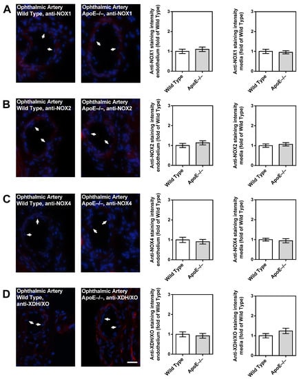 To visualize and evaluate the expression levels of pro-oxidative enzymes (NOX1, NOX2, NOX4, and XDH/XO) and LOX-1, we conducted the following procedures on aortas and ophthalmic arteries obtained from both wild-type and ApoE−/− mice: First, aortas and ophthalmic arteries were meticulously dissected and then immersed in 4% paraformaldehyde overnight. Subsequently, they were embedded into paraffin blocks, and cross-sections of the vasculature, measuring 7 µm in thickness, were generated. These cross-sections were subjected to immunostaining using rabbit antibodies specific to NOX1, NOX2, NOX4, XDH/XO, or LOX-1 (see Table 2 for specifications). As a secondary antibody, a Rhodamine Red-X-conjugated goat anti-rabbit polyclonal antibody (Dianova GmbH, Hamburg, Germany; catalog number: 111-295-003) was applied at a dilution of 1:200, with an incubation period of 1 h at room temperature. Negative control sections were treated with blocking media and the secondary antibody. Finally, the prepared slides were mounted using VECTASHIELD® Mounting Medium with DAPI (BIOZOL Diagnostica Vertrieb GmbH, Eching, Germany) and cover-slipped.