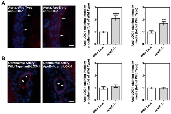 Figure 8. LOX-1 immunoreactivity in the aorta and in the ophthalmic artery of wild-type and ApoE−/− mice. In the aorta from ApoE−/− mice, immunoreactivity to LOX-1 was increased in both the endothelium and the smooth muscle compared to wild-type mice (A). In contrast, LOX-1 staining was very faint in the endothelium of the ophthalmic artery from both mouse genotypes (B). Although pronounced LOX-1 immunoreactivity was observed in the ophthalmic artery smooth muscle, there was no difference in staining intensity between ApoE−/− and wild-type mice. Data are presented as mean ± SE normalized to wild-type controls (n = 8 per genotype; *** p < 0.001; ** p < 0.01, ApoE−/− versus wild-type mice). The white arrows point to the endothelial layer. Blue: DAPI; Red: Rhodamine Red-X-coupled. Scale bar = 20 µm.