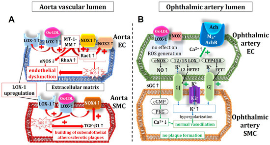 Figure 9. Intracellular pathways in the vascular endothelium and in the smooth muscle of the aorta (A) and the ophthalmic artery (B) in ApoE−/− mice. Of note, in the aorta, the expression of NOX1 and NOX2, responsible for the ROS production and the endothelial dysfunction, were increased in the endothelium but not in the smooth muscle, where an increased expression and activity of NOX4 could be shown. This suggests that NOX4 plays a role in modification of atherosclerotic plaques in the vascular smooth muscle layer. Unlike in the aorta, in the ophthalmic artery, no LOX-1 upregulation and no increase in ROS production were observed. Moreover, endothelium-dependent vasodilatory mechanisms were not altered in the ophthalmic artery. Ach: acetylcholine; M3-AchR: M3 muscarinic acetylcholine receptor; EC: endothelial cell; SMC: smooth muscle cell; MT-1-MM: membrane type 1 matrix metalloproteinase; RhoA: Ras homolog family member A; Rac1: Ras-related C3 botulinum toxin substrate 1; Ox-LDL: oxidative low-density lipoprotein; LOX-1: lectin-like oxidized low-density lipoprotein receptor 1; NOX: nicotinamide adenine dinucleotide phosphate oxidase; ROS: reactive oxygen species; TGF-β1: transforming growth factor β1; eNOS: endothelial nitric oxide synthase; Kir: inwardly rectifying potassium channels; 12/15 LOX: 12/15 lipoxygenase; CYP450: cytochrome p450 monoxygenase; NO: nitric oxide; sGC: soluble guanylate cyclase; cGMP: cyclic guanosine monophosphate; PKG: protein kinase G; GJ: gap junctions; EET: epoxyecosatrienoic acid; 12-HETE: 12-hydroxyeicosatetraenoic acid. Up arrows mean increase or upregulation, and down arrows mean decrease or downregulation.
