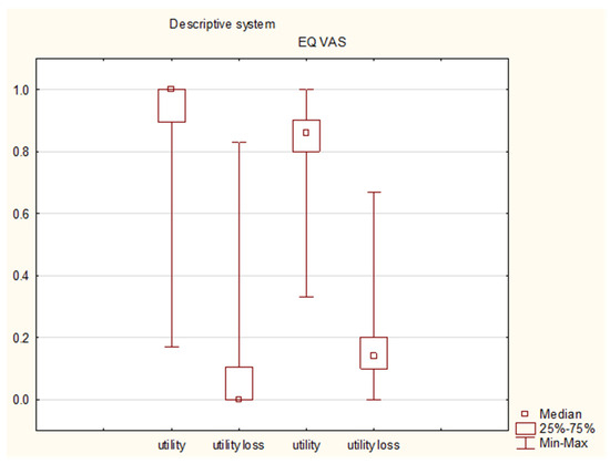 29]. The reported utilities varied between 0.17 and 1, with a median of 1. The EQ VAS answers showed utilities between 0.33 and 1, with a median utility of 0.86 (IQR: 0.8-0.9); corresponding utility losses reached a median of 0 (IQR: 0–0.106) in the descriptive system and 0.14 (IQR: 0.1–0.2) in the EQ VAS (