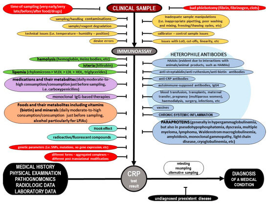 - Benoist, J.F.; Orbach, D.; Biou, D. False Increase in C-Reactive Protein Attributable to Heterophilic Antibodies in Two Renal Transplant Patients Treated with Rabbit Antilymphocyte Globulin. Clin. Chem. 1998, 44, 1980–1985. [Google Scholar] [CrossRef] [PubMed]