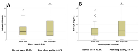 Salivary interleukin 1 beta concentrations in students with normal or poor sleep quality based on the (A) Athens Insomnia Scale and (B) Pittsburgh Sleep Quality Index; * p < 0.05. Percentages of participants in each category are represented below the x axis (n = 72). Abbreviations: interleukin 1 beta, lL-1β.