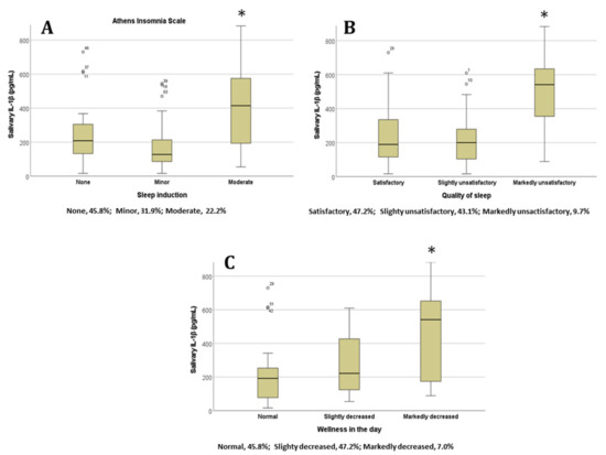 In order to analyze the sleep quality items, which were mostly related to different IL-1β concentrations, we examined each item of the AIS and PSQI for significant differences across the categories. For the AIS, the IL-1β concentration was significantly higher for the ‘Sleep induction’ (Figure 2A), ‘Overall quality of sleep’ (Figure 2B), and ‘Sense of well-being during the day’ (Figure 2C) item categories when the students had selected the ‘Moderate problem’ option (p < 0.05 in all cases, ANOVA test).