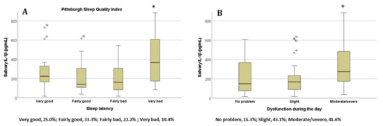 The salivary IL-1β concentration in students based on their answers to the items (A) ‘Sleep latency’ and (B) ‘Daytime dysfunction’ on the Pittsburgh Sleep Quality Index; * p < 0.05. Percentages of participants in each category are represented below the x axis (n = 72). Abbreviations: interleukin 1 beta, lL-1β.