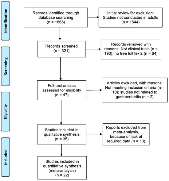 Of the 1865 research articles identified initially through a database search, 1544 articles were excluded for not being conducted in adults. Of the remaining 321 studies, studies excluded with reasons were as follows: 190 studies did not involve clinical trials; 84 were not full articles; and 12 did not meet the eligibility criteria and were not related to gastroenteritis. The results presented below include analyses of 35 studies for the systematic review (Figure 1).
