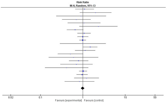 Due to the unavailability of relevant data, a meta-analysis was conducted using 22 out of 35 (63%) studies. Table 2 shows the relative risk and 95% confidence intervals (CIs) of the effect of probiotics in each study. Risk ratios demonstrated a protective effect in 50% of the studies (n = 11); however, 95% CIs included 1 in each of them. The pooled relative risk was 0.99, with 95% CI being 0.90 and 1.09. A test for the overall effect showed a p-value of 0.37, meaning that there was not enough evidence to indicate that the intervention had a significantly more protective effect than controls. The value of τ2 indicated low variation in true effects. The Higgins H test (I2) was 6%, indicating a homogeneous nature of the weights of the studies evaluated in the meta-analysis. It is important to note that although the clinical trials reviewed here were homogenous in nature, they were widely diverse in terms of etiologies and the type of probiotics used.
