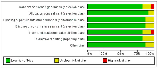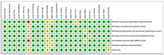 As shown in Figure 4 and Figure 5, the domains evaluated in this review were as follows: (a) Random Sequence Generation: it is a form of selection bias (biased allocation to interventions), resulting from insufficient generation of a randomized sequence. (b) Allocation Concealment: it is also a type of selection bias (biased allocation to interventions), owing to insufficient allocation concealment prior to assignment. (c) Blinding of Participants and Personnel: this is a performance bias due to participants’ and personnel’s knowledge of the assigned interventions during the study. (d) Blinding of Outcome Assessment: this is a detection bias due to the outcome assessors’ knowledge of the allocated interventions. (e) Incomplete Outcome Data: this is an attrition bias due to the quantity, character or treatment of incomplete outcome data. (f) Selective Reporting: this is bias in reporting, owing to the selective reporting of outcomes. (g) Other Bias: this category encompasses biases caused by issues not covered elsewhere in the table. In Figure 4 and Figure 5, the rating scales of bias are high (red), low (green), and unclear (yellow).