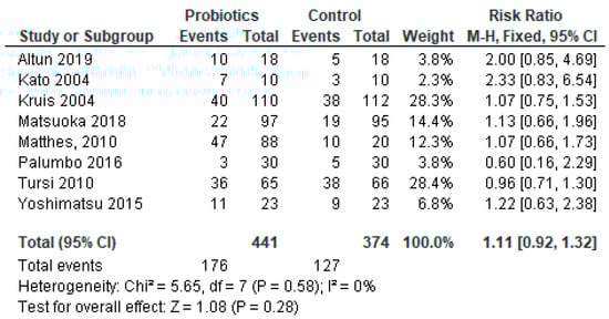 Among the reviewed studies, the majority (23 out of 35, 66%) had IBDs. Of the patients with IBDs, 12 had UC only; of them, 1 was ineffective and 11 were found effective for the treatment with probiotics in our systematic review. In this cohort of patients with IBDs, eight had both UC and CD and two had CD as a single disease entity diagnosed (Table 1). We conducted meta-analysis on a subgroup of studies that reported UC only. Three of the studies [29,50,54] were not included in the analysis because they did not include a control group in the protocols. The meta-analysis results of sub-group analysis are presented in Figure 7.