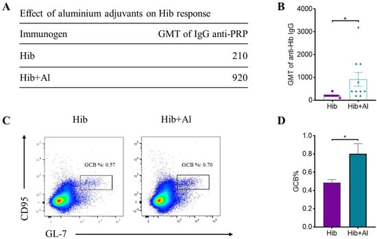 Hib and Hib+Al vaccine-induced humoral immune response. (A) The GMT level of IgG anti-PRP in Hib- and Hib+Al-immunized mice; (B) comparison plot of GMT levels for each mouse in Hib and Hib+Al vaccines (n = 10); (C) the responses of GCBs in the spleen were analyzed at day 21, and the representative flow cytometry charts of GCBs are shown; (D) the percentages of the GCB cells are shown (n = 4). Error bars represent the SEM. * p < 0.05.