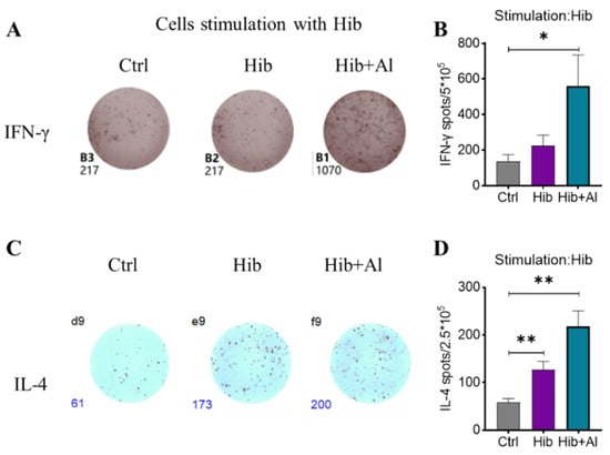 ELISpot analysis of IFN-γ and IL-4 in Hib- and Hib+Al-immunized mice. Mice were immunized with different vaccines, and splenocytes were collected on day 21 post immunization (A,C). Hib-specific IFN-γ and IL-4 in spleens were measured using ELISpot assay (n = 5) after injection of the Hib or Hib+Al vaccines or in the control group. The representative plot is shown in A,C and the statistical analysis is shown in (B,D). Error bars represent SEM. * p < 0.05; ** p < 0.01; (Student’s t-test).