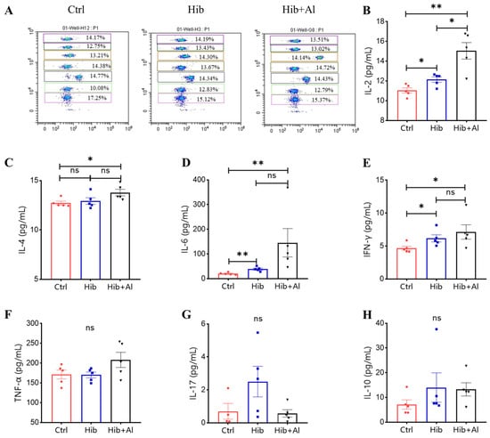 Flow cytometry analysis of Hib-specific Th1/Th2/TH17 cytokine expression. (A) The representative flow cytometry chart of different cytokines. The APC level represents different cytokines, and the cytokines from top to bottom are IL-2, IL-4, IL-6, IFN-γ, TNF-α, IL-17, and IL-10; (B) the IL-2 expression levels; (C) the IL-4 expression levels; (D) the IL-6 expression levels; (E) the IFN-γ expression levels; (F) the TNF-α expression levels; (G) the IL-17 expression levels; (H) the IL-10 expression levels; n = 5, error bars represent the SEM. * p < 0.05; ** p < 0.01(Student’s t-test); ns, no significant difference.
