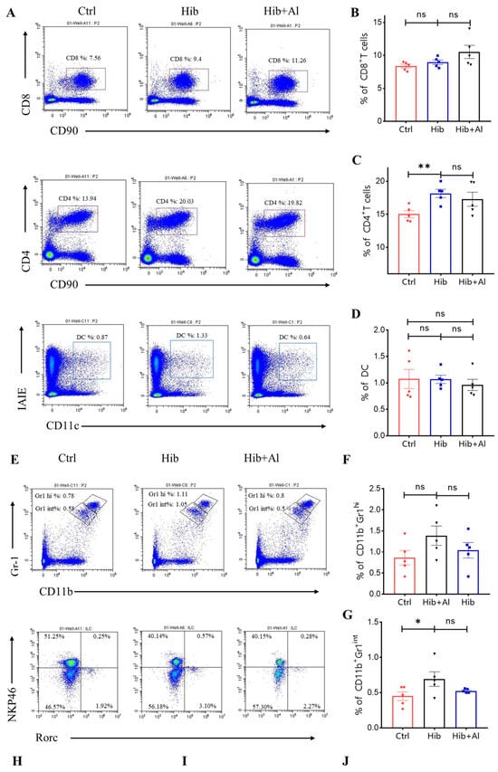 Flow cytometry analysis of immune cells. (A,E) The representative flow cytometry charts of different cells. CD8+ T cells, CD4+ T cells, MDSC, DC: gated in live CD45+, ILCs: gated in live CD45+CD90+CD3−; (B) the percentage of the CD8+ T cells (n = 5); (C) the percentage of the CD4+ T cells (n = 5); (D) the percentage of the DC cells (n = 5); (F) the percentage of the monocytes (CD11b+Gr1hi) (n = 5); (G) the percentage of the neutrophil (CD11b+Gr1int) (n = 5); (H) the percentage of the ILC1 (n = 5); (I) the percentage of the ILC3 (n = 5); (J) the percentage of the ILC2 (n = 5); error bars represent the SEM. * p < 0.05; ** p < 0.01 (Student’s t-test); ns, no significant difference.