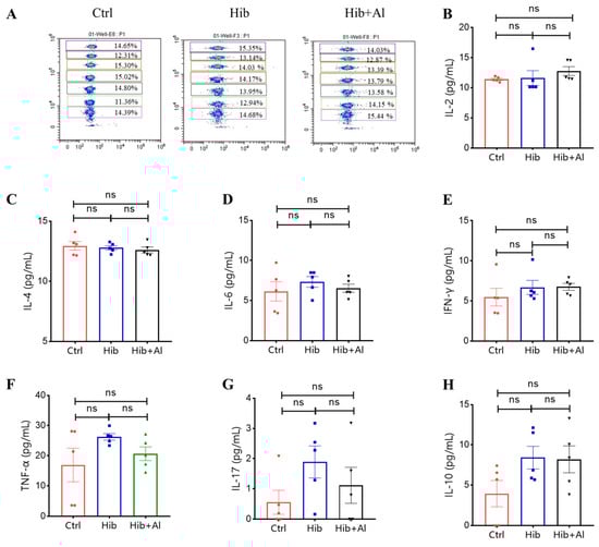 To determine whether the aluminum adjuvant could disrupt the immune system, we tested the Th1/Th2/Th17 cytokine levels in serum from the immunized mice. The results showed that there were no significant differences in Hib+Al- and Hib-vaccine-immunized mice (Scheme 1), indicating that the aluminum adjuvant in the Hib vaccine could also maintain the homeostasis of immune cells. Together, these results demonstrate that the aluminum adjuvant could improve Th1 and Th2 cytokine expression.