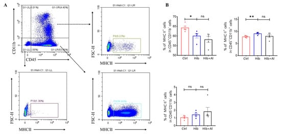 Flow cytometry analysis of MHC II expression in myeloid cells. (A) The representative flow cytometry chart of MHC II expression; (B) the percentage of MHC II expression. Error bars represent the SEM. * p < 0.05; ** p < 0.01 (Student’s t-test); ns, no significant difference.