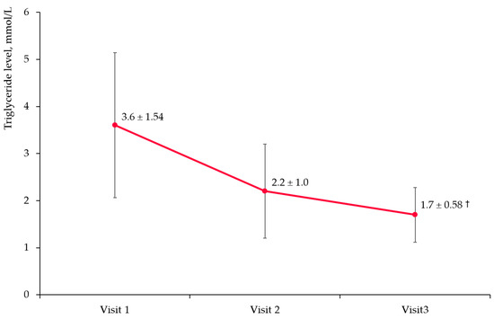 Triglyceride level changes in overall cohort. Notes: The dots represent mean values and the error bars are standard deviations; †—p < 0.0001 compared to baseline.