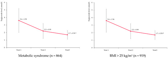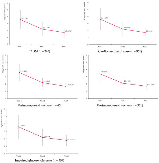 Triglyceride level change in target subgroups. Notes: BMI—body mass index; T2DM—type 2 diabetes mellitus; the dots represent mean values, and the error bars are standard deviations. † p < 0.001 compared to Visit 1.
