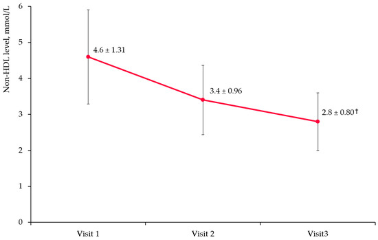 Non-HDL cholesterol level changes in overall cohort. Notes: HDL—high-density lipoprotein; †—p < 0.0001 compared to baseline.