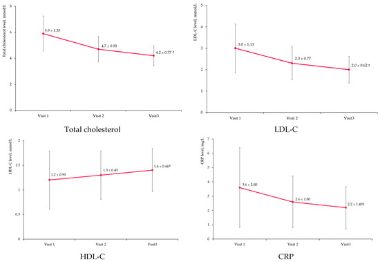 Notes: LDL-C—low-density lipoprotein cholesterol; HDL-C—high-density lipoprotein cholesterol; CRP—C-reactive protein; †—p < 0.001 compared to baseline.