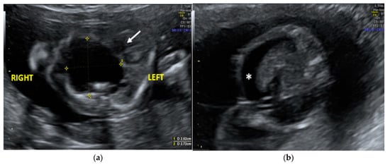 Transabdominal ultrasound managed at 23 weeks of gestational age according to amenorrhea (21.5 weeks according to first ultrasound): (a) Transverse fetal thoracic scan showing the large anechoic cystic formation occupying the entire right hemithorax. Fetal heart (arrow) and mediastinum were extremely shifted on the left due to the cyst compression; (b) transverse fetal transabdominal scan showing marked ascites (*).