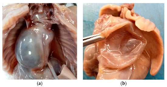 Mature triphyllic fetal cystic teratoma: (a) Cystic formation on the right side, retropulmonary and supradiaphragmatic, adhering to the aorta and diaphragm, with no continuity to other anatomical structures. (b) The cyst was single, spherical in shape, with a smooth surface, purplish white in color and, after cutting it, unilocular with a serohematic content.