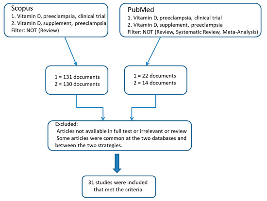 For this literature review, we searched Scopus and PubMed using the words “Vitamin D” and “preeclampsia” to retrieve articles related to vitamin D supplementation or vitamin D serum levels in women with preeclampsia until May 2023. We also used the Boolean Operator NOT with the word “Review” in Scopus and the words “Review”, “Systematic Review”, and “Meta-Analysis” in PubMed. No language restrictions were applied, and all types of studies, excluding animal studies, were included in the review.