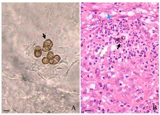 A slightly foul odor emanating from the lesions was noticed, and according to the patient, the lesion itched. During this period between the abandonment of therapy and the first hospital appointment, he stated that no topical or systemic therapy was used. Biochemical levels of blood glycemia, cholesterol, liver transaminases, gamma-glutamyl transferase, triglycerides, bilirubin, urea, and creatinine were normal. Additionally, the patient was serologically negative for hepatitis, syphilis, and HIV. Microscopic examination of the three different lesions in a 10% potassium hydroxide (KOH) wet mount revealed the presence of muriform cells in all samples (Figure 1A, black arrow). A histopathological study carried out in skin sections collected from the leg lesion and stained with hematoxylin and eosin (HE) showed pseudoepitheliomatous hyperplasia in the epidermis and muriform cells (black arrow) surrounded by granuloma in the dermis (Figure 1B, blue arrow).