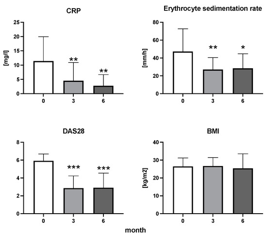 The dynamics of CRP, erythrocyte sedimentation rate, DAS28, and BMI in patients with rheumatoid arthritis before the initiation of bDMARDs and at 3 and 6 months during ongoing treatment (p < 0.05 = *, p < 0.01 = **, p < 0.001 = ***).