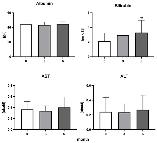 Albumin, bilirubin, enzymatic activity of aspartate aminotransferase (AST), and alanine transaminase (ALT) in patients with rheumatoid arthritis before the initiation of bDMARDs and at 3 and 6 months during ongoing treatment (p < 0.05 = *).