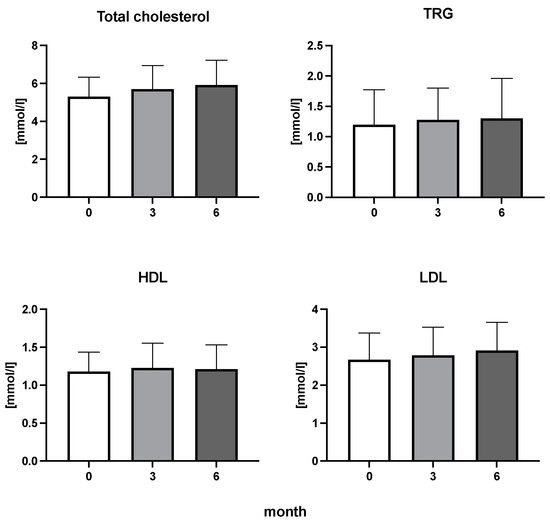 Total cholesterol, triglycerides (TRG), high-density lipoproteins (HDL), and low-density lipoproteins (LDL) cholesterol in patients with rheumatoid arthritis before the initiation of bDMARDs and at 3 and 6 months during ongoing treatment.