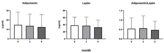 Adiponectin, leptin, and the ratio of adiponectin to leptin in patients with rheumatoid arthritis before the initiation of bDMARDs and at 3 and 6 months during ongoing treatment.