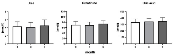 Urea, creatine, and uric acid concentration in patients with rheumatoid arthritis before the initiation of bDMARDs and at 3 and 6 months during ongoing treatment.