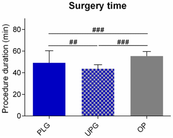 Schematic representation, depicting the mean operation time (procedure duration), based on the three different insertion techniques. More precisely, this schematic representation depicts the mean operation time (procedure duration), based on the three different insertion techniques. ### p < 0.001, ## p < 0.01 (Kruskal-Wallis with Dunn’s post hoc test).