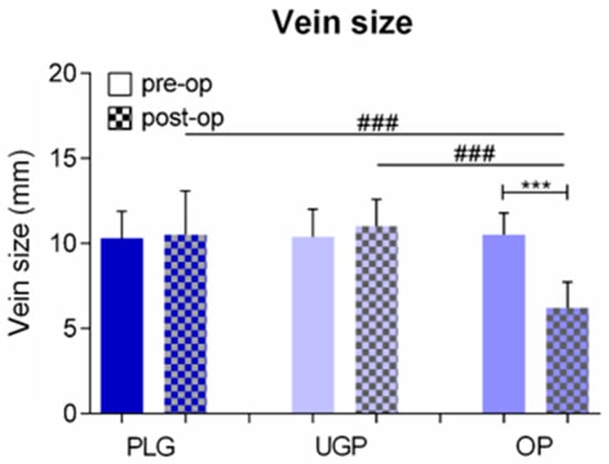 Presentation of the pre- and post- insertion internal diameter of the recipient vein, according to the utilized technique.