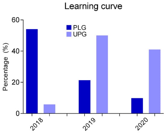 Another important aspect of our survey was intimately related to the learning curve related with the ultrasound-guided transcutaneous technique during our study. It seems that there was a trend toward an increasing utilization of this method, which reached its maximum during the last year of the study. More precisely, at the beginning of our protocol, it was utilized in about 20% of our participants, whereas this percentage was subsequently increased to >42% at the end of our survey. This means that with time, our personnel gained significantly more experience and confidence with this method.