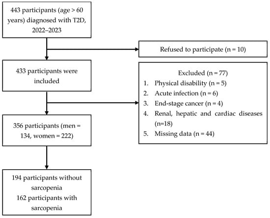 Figure 1 shows that 443 patients diagnosed with T2D were initially recruited for the study, of whom 87 were eliminated and 356 participants were enrolled.