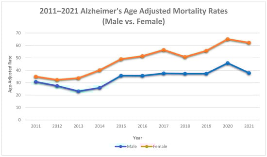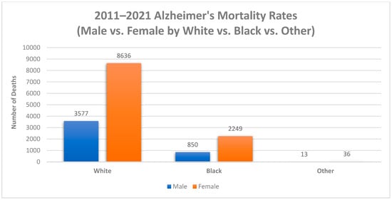 Between 2011 and 2021, Mississippi reported a total of 15,358 Alzheimer’s deaths. The source population from which mortality rates between 2011 and 2021 were derived was obtained from the Mississippi statistically automated health resource system. Most cases were reported among females (70.9%), whites (79.5%), and adults 65 years and older (98.9%) (Figure 1 and Figure 2). The overall age-adjusted mortality rate increased from 33.5 deaths per 100,000 in 2011 to 52.9 deaths per 100,000 in 2021 (a 36.7% increase). In the United States, the age-adjusted mortality rate also increased between 2011 and 2021 (34% increase). However, Mississippi had a higher increase in age-adjusted mortality (36.7% increase) between 2011 and 2021 than the United States (34% increase). In 2011, the age-adjusted mortality rate in the United States was 24.7 deaths per 100,000, which is lower than the age-adjusted mortality rate in Mississippi in 2011 (33.5 deaths per 100,000) [14]. In 2021, the age-adjusted mortality rate in the United States was also lower than the age-adjusted mortality rate in Mississippi, with Alzheimer’s deaths causing only 36 deaths per 100,000 in the United States and 52.9 deaths per 100,000 in Mississippi [14].