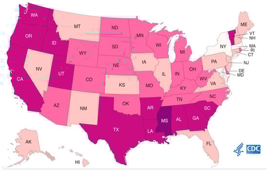 According to the Centers for Disease Control and Prevention, southern states had higher age-adjusted mortality rates associated with Alzheimer’s disease than any other states within the United States in 2021. These southern states include Texas (41.9 deaths per 100,00), Arkansas (43.2 deaths per 100,000), Louisiana (42.9 deaths per 100,000), Mississippi (52.9 deaths per 100,000), Alabama (46.8 deaths per 100,000), Georgia (44.5 deaths per 100,000), and South Carolina (40.9 deaths per 100,000) [15]. Of the seven states with the highest age-adjusted Alzheimer’s mortality rates, Mississippi had the highest of the seven states. Explanations for these regional disparities in mortality rates include non-modifiable risk factors, such as lack of a balanced diet, consuming foods high in sugar, consuming foods high in sodium, smoking, excessive drinking, and poor management of medical conditions, such as obesity in mid-life, diabetes, hypertension, stroke, heart problems, high cholesterol, and depression. All of these risk factors are most common within southern states, especially in Mississippi, which increases the risk of Alzheimer’s disease and mortality (Figure 3) [16,17,18,19].