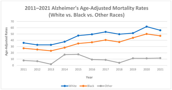 Between 2011 and 2021, among blacks, age-adjusted Alzheimer’s mortality rates increased by 42.0% (27.3 deaths per 100,000 to 47.1 deaths per 100,000), with an average annual increase of 7.32% (AAPC, 7.32%, 95% CI, 4.89% to 10.97%). In whites, there was a 35.8% increase in Alzheimer’s mortality rates (35.9 deaths per 100,000 to 55.9 deaths per 100,000), with an average annual increase of 5.90% (AAPC, 5.90%, 95% CI, 2.80% to 10.07%). In other races, there was a 32.8% increase in Alzheimer’s mortality rates (7.8 deaths per 100,000 to 11.6 deaths per 100,000), with an average annual increase of 4.19% (AAPC, 4.19%, 95% CI, −5.5% to 20.2%).