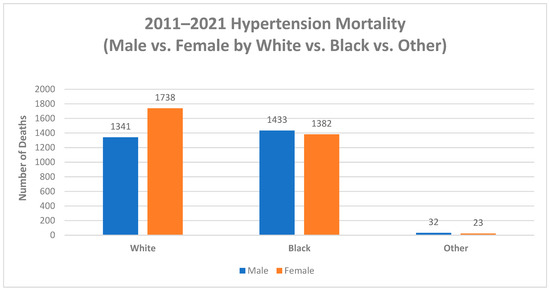 Hypertension deaths by Sex and Race, Mississippi, 2011–2021.