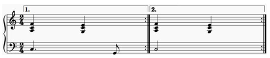 - Drill no. 1 (Figure 1): was based on two alternative functions IV–I; the hand-gripping was synchronized with the subdominant chord (the Tonic (I) or subdominant (IV) chord refers to the name of the harmonic function (the name depends of the relationship to the home note/key) [41]) (beat 1); the later relaxation was synchronized with the second beat on the tonic chord (the tonic (I) or subdominant (IV) chord refers to the name of the harmonic function (the name depends of the relationship to the home note/key) [41]) (beat 2).