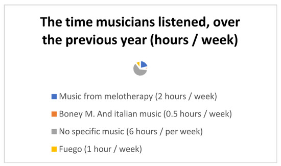 Initial delayed accommodation with the musical examples could further be explained by individual musical preferences in terms of style and genre as well as musical background. In order to assess the relation between music preference and background the subjects answered a set of questions at the beginning of this study. The questions addressed topics such as artist(s) listened to during the previous year; time dedicated to music listening (Figure 5), as well as favorite musician/band. The need for this questionnaire comes from the fact that, in many cases, music therapy sessions use random criteria for organizing playlists (later on will be discussed the importance of having principles of choosing the playlist for music therapy sessions). The favorite musician of the subject was: none (2 answers), Fuego (2 answers), Phil Collins (1 answer) and Liliac (1 answer).