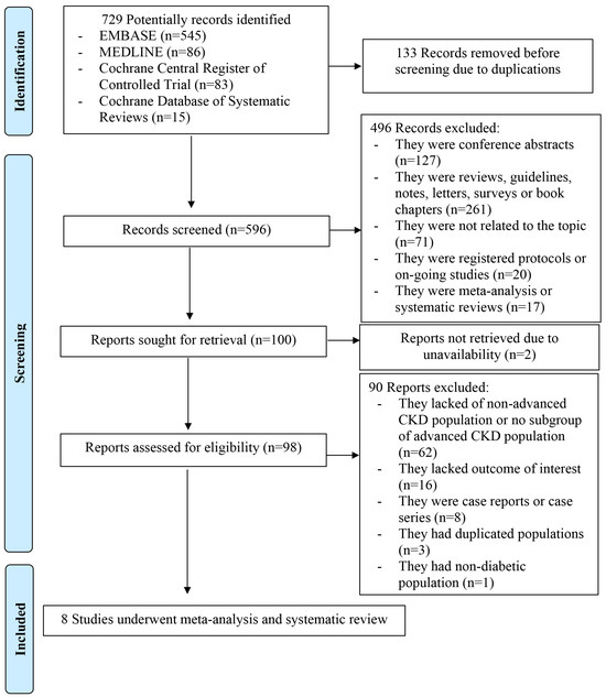 A total of 729 potential articles were retrieved by our search strategy (Figure 1), of which 133 were duplicates. The remaining 596 articles were screened for title and abstract, and 496 articles were excluded due to the publication type, lack of topic relevance, and ongoing studies, and 2 articles could not be retrieved due to access unavailability. Therefore, 98 studies underwent full-length review. Of these, 90 studies were excluded due to a lack of an advanced CKD population or a subgroup analysis of the advanced CKD population, the lack of a diabetic population, absent outcomes of interest, case reports or case series, or duplicated population. Ultimately, 8 studies consisting of 27,639 patients were included in this systematic review. These 8 studies were comprised of 4 non-randomized controlled studies [21,23,25,26], 3 retrospective cohorts [32,33,34], and 1 randomized controlled trial (RCT) [22] (Table 1).