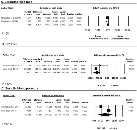 There were no reported cases of myocardial infarction, stroke, or heart failure in any of the included studies. However, short-term (within 1 year) cardiac functions were assessed with left ventricular mass index (LVMI), cardiothoracic ratio (CTR), serum pro-BNP, and systolic blood pressure (SBP). One trial [21] reported that prescribing GLP-1RAs for a year significantly reduced LVMI (−37.7 ± 46.2 g/m2) compared to the control, which showed no significant change (−15.0 ± 47.5 g/m2). From this meta-analysis, treatment with GLP-1RAs significantly reduced CTR with a standardized mean difference (SMD) of −1.2% (95% CI −2.0, −0.4; I2 = 0%; 2 studies [21,34]) as compared to baseline (Figure 2A). Moreover, GLP-1RAs also significantly reduced serum pro-BNP compared to control with an SMD of −335.9 pmol/L (95% CI −438.9, −232.8; I2 = 12%; 2 studies [21,22]) (Figure 2B). However, GLP-1RAs did not show a significant decrease in SBP when compared to controls, with notable significant heterogeneity in this meta-analysis (SMD of −12.6 mmHg; 95% CI −39.8, 14.5; I2 = 87%; 2 studies [21,22]) (Figure 2C).