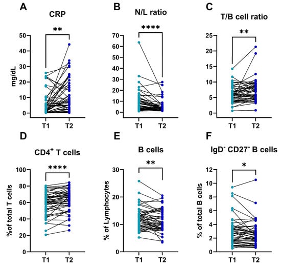 Inflammatory and cellular immune dynamics in AP patients during the first 48 h after diagnosis. Concentration of CRP (mg/dL) (A); N/L ratio (B); T/B cell ratio (C); (D–F) percentage of CD4+ T cells (D), B cells (E), and DN B cells (F) in AP patients (n = 50) at admission (T1) and 48 h after diagnosis (T2). Significance determined by paired t tests (A,C–F) and Wilcoxon matched-pairs signed-rank test (B). AP, acute pancreatitis; HC, healthy control; CRP, C reactive protein; N/L, neutrophil/lymphocyte. * p < 0.05; ** p < 0.01; **** p < 0.0001.